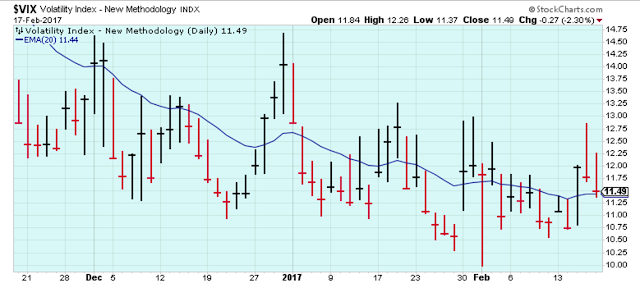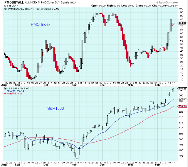 We had a bit of spiky behavior in the VIX the last few days. With the PMO at the peak and prices so stretched, this jumpy VIX is to be expected.