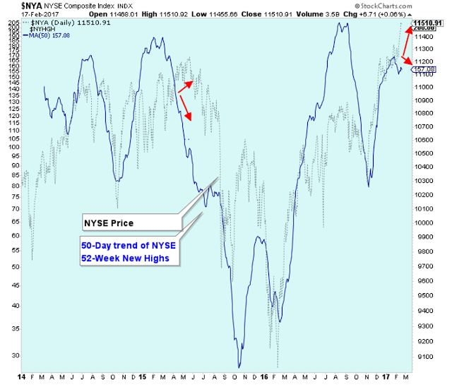 The 50-day average of new 52-week highs has stalled a bit and shows a lower high. Do we have the beginning of another negative divergence?