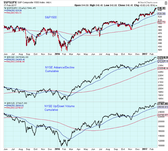 The chart below shows that breadth and moving averages are confirming stock prices at new highs.