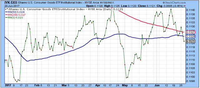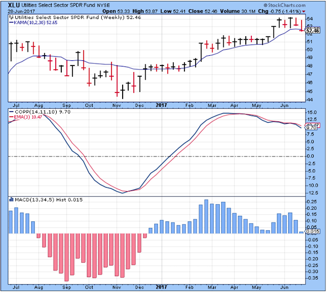This weekly chart of Utilities shows it dropping under the moving average along with some weak momentum.