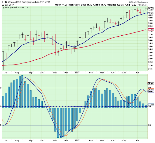 The technicals for EEM have improved, but I am not sure if this chart shows an ETF rolling over or about to pop out above a new base. Either way, it looks extended to me.