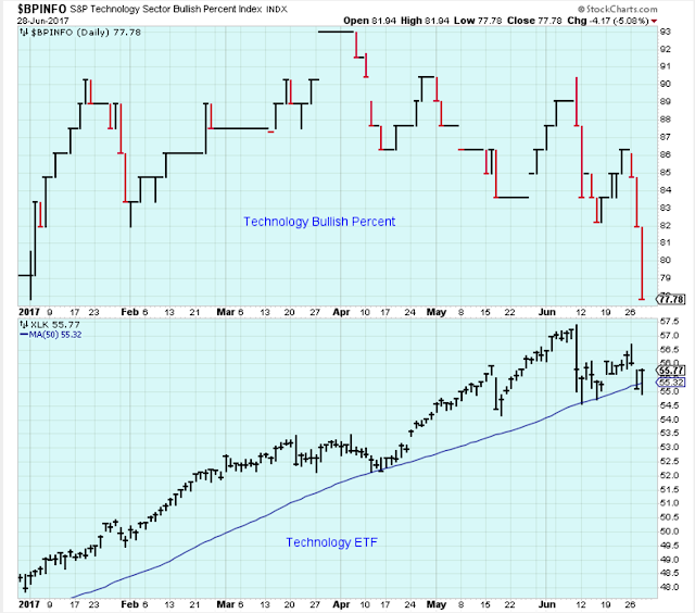 It seemed as though some of the selling pressure on Technology was reduced with today's rally. But this chart of the Technology bullish percent indicates that many stocks in this index showed weakness. It looks like we had a counter rally today in a larger downtrend for Technology.