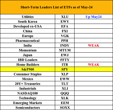 Many of the ETFs that I monitor look like they might be starting to top out based on the momentum indicators. In addition, leadership is defensive with Utilities in today's top spot. In addition, Staples and Treasuries are performing well.