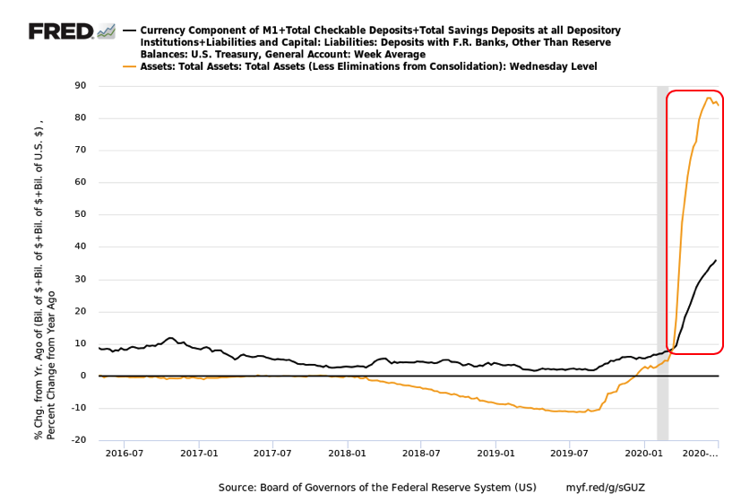 Y/Y growth rate in the money supply and the Fed balance sheet.