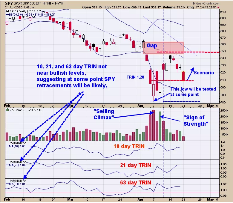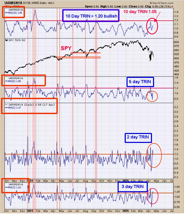 We ended up 29.28% for 2024; SPX up 23.67% for the year. Looking at the volume chart; we have a “Selling climax” on April 7 and a “Sign of Strength” on April 9; which are two necessary requirements for producing a bottom. What that means is that the market may have started a basing pattern and that the downtrend is ending. Most likely the “Selling Climax” April 7 low will be tested at least once before the uptrend begins. Today’s trading tested the April 10 low on lighter volume suggesting support. However the TRIN moving averages are not at bullish levels suggests the potential SPY bounce will be limited. Staying neutral for now.