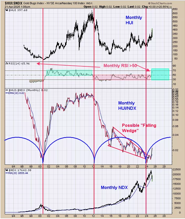 We are thinking this chart is an interesting chart. Above is the monthly HUI/NDX ratio (middle window); bottom window is the monthly NDX and top window is the monthly HUI.Referring back to the monthly HUI/NDX with its RSI above it; we noted a 12 year cycle red line which last time came in late 2024.When the monthly HUI/NDX ratios is rising, than HUI is outperforming NDX and vice versa.When the monthly HUI/NDX is rising and the RSI in general stays above 50 (noted in shaded green) and when HUI/NDX is falling than in general the RSI stays below 50 (Noted in shaded pink).Right now the RSI stands at 65.96 showing that HUI is outperforming NDX and a reading above 60 kick in the idea another up-leg in this ratio has started.What this chart suggests is that another 12 year cycle has started where HUI will outperform the NDX.