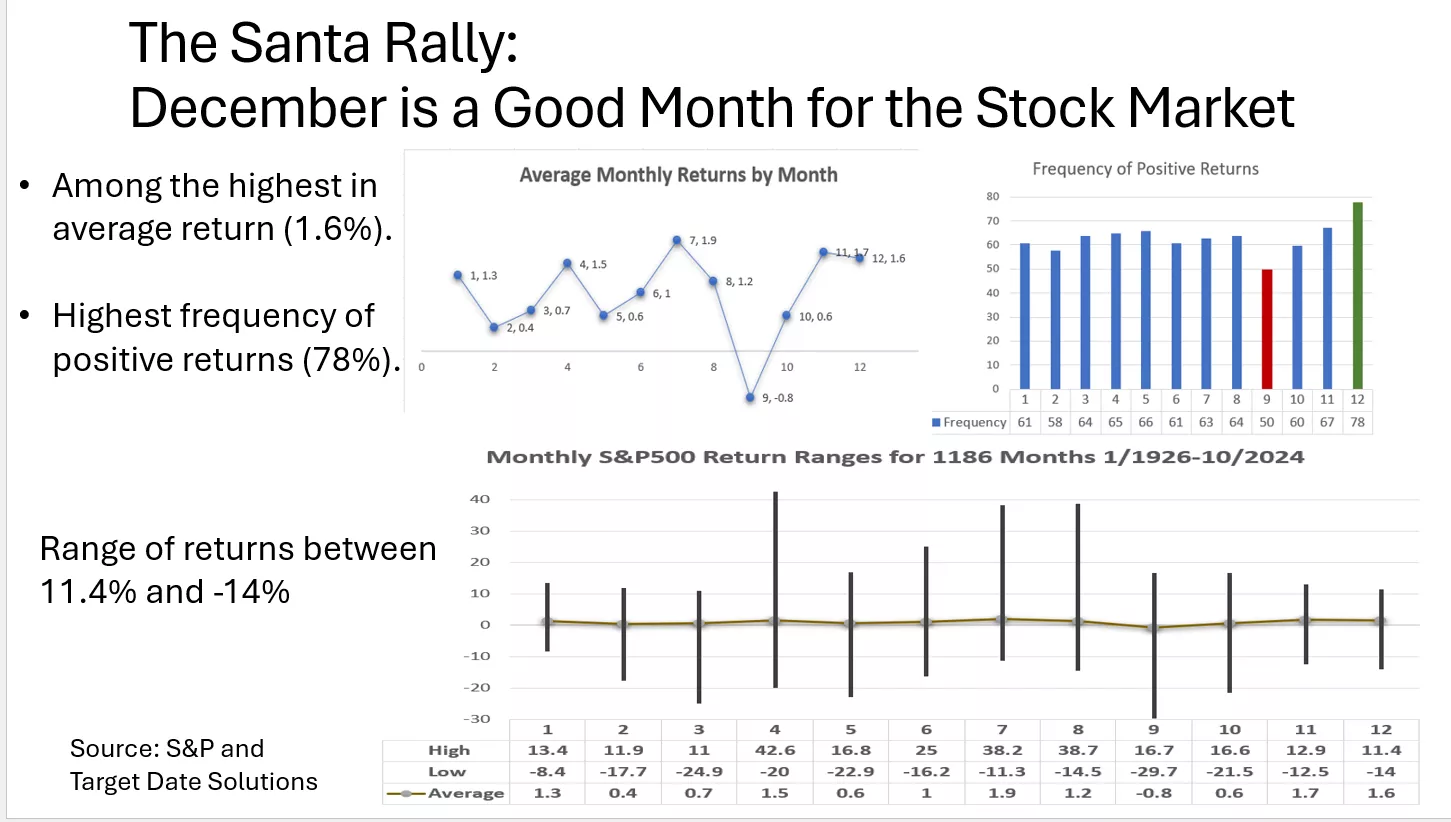 - The Santa Claus rally, a historical December market trend, typically brings positive returns, with December outperforming most other months.