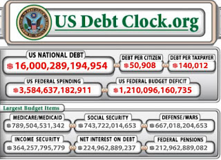 It is well worth your time to explore the National Debt Clock by clicking on the line below the image. In the upper right area of the clock is a "time machine" that allows you to travel back and compare how these figures have changed.