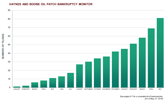 The oil price crash that started in the second half of 2014 has claimed many E&P victims.According to Haynesboone.com, there are 77 E&P bankruptcies from 2015 to May 2016 and over half of the filed chapter 11's are in Texas. We did warn several months ago that more pain to come in the over-saturated oil E&P sector. There are 110+ publicly traded E&P companies in North America, not counting the integrated major like ExxonMobile (XOM), Chevron (CVX), etc., and not all are healthy enough to survive an oil crash like this.