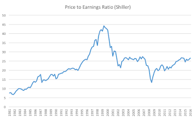 To correct for these trends we can do a simple adjustment and look instead at the price-to-earnings ratio. I will use here the one constructed by Robert Shiller (although some ague that recently the index could be less informative because of the way earnings are being calculated).
