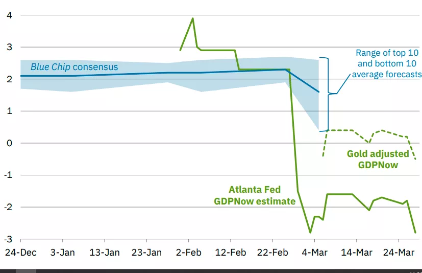 Real GDP growth estimates for 2025: Q1 have plunged. A decline in housing starts, manufacturing, car sales, and retail trade have soured the outlook. Consumer sentimenthit a 12-year low as the fear of tariffs rip through the economy.