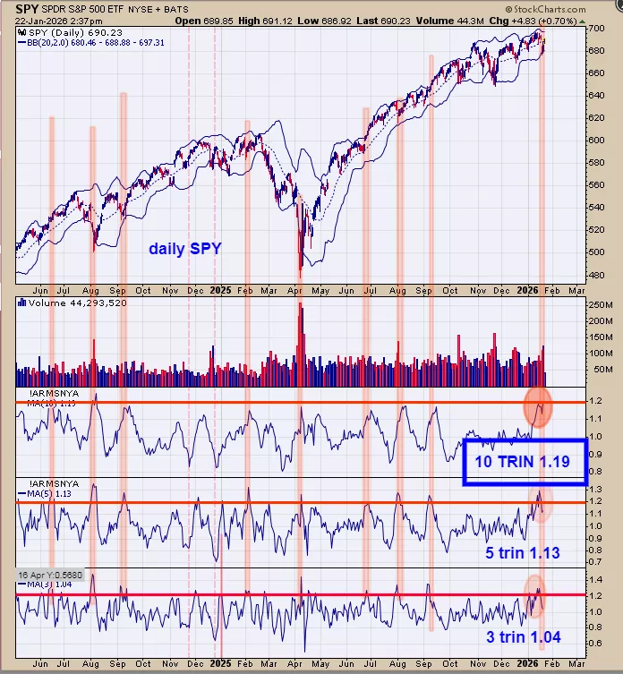 The bottom window is the 3 day TRIN; next higher window is the 5 day TRIN and next higher window is the 10 day TRIN. Trin closes above 1.20 show there is panic in the market and panic only form near lows. The more days of panic readings the stronger the rally and therefore the 10 day TRIN is more important than the 3 or 5 day TRIN. Current 10 day TRIN stands at 1.19. Shaded in pink on the chart above the times when the 3, 5 and 10 day TRIN reached panic levels near 1.20 and higher where those panic reading occurred on the SPY chart. In call cases the market moved higher for the short term and most for the intermediate term.