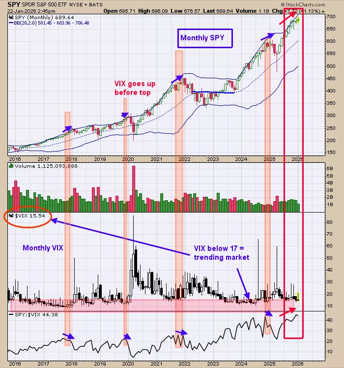 Above looks at the larger picture for the SPY; this chart goes back to 2015 and is on the monthly time frame. Bottom window is the monthly SPY/VIX ratio and top window is the monthly SPY. Usually the VIX will start going up (SPY/VIX will go down) before a top is reached in the SPY. We shaded in pink on the chart above when this condition present. Currently the SPY on the monthly time frame has made higher highs and the SPY/VIX ratio (bottom window) also has made higher highs, though there is a modest dip currently at the end of the chart which is a minor divergence. However this minor divergence may “go away” before the month is out. Staying long the SPX for now.