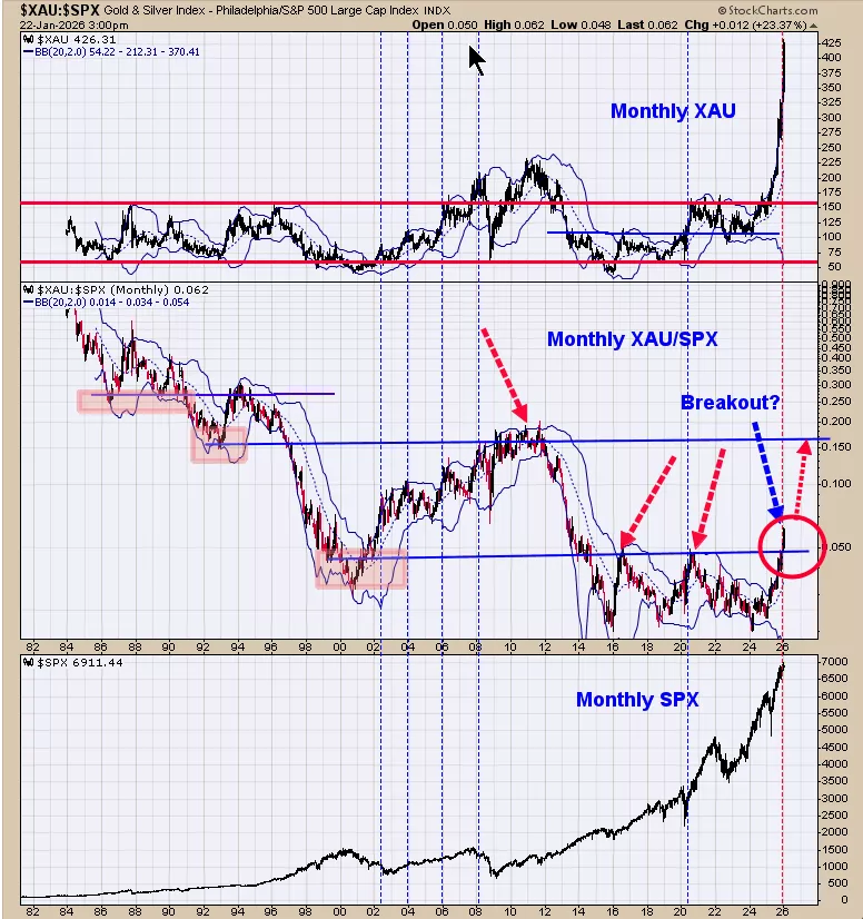 The middle window is the monthly XAU/SPX. When this ratio is rising than XAU is outperforming SPX and when this ratio falling than SPX is outperforming the XAU. This ratio has been rising since the start of 2024 (2 years) showing that gold stocks have been outperforming SPX stocks. The red circle on the chart shows a breakout where it closed above its previous highs of 2016 and 2020 highs near .05. This breakout suggests the XAU/SPX ratio will go (at some point) to the next higher resistance which is the 2010 high near .15. So what does that mean? If the .15 level is reached it will mean that gold stocks (XAU) will outperform the SPX stocks by 300%.Gold stocks may be the place to be over the next several years. Long GDX on 9/29/25 at 75.76.