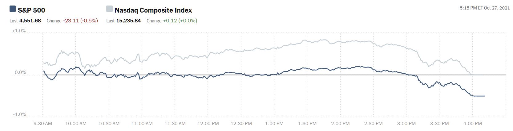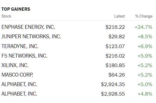 The S&P 500 closed down 23 points at 4,552, but not before hitting an intra-day high of 4,585. The Dow Jones Industrial Average closed down 266 points at 35,491 despite trading as high as 35,835 early in the day. The Nasdaq Composite closed unchanged at 15, 236 though it did reach 15,365 during the day's trading session. Wednesday's top gainers were all in tech save for home improvement and building products manufacturer Masco.