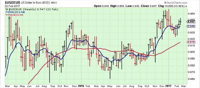 Since the election in November, the USD has been strong against the Euro, but peaked at the top of the range established over the last two years.
