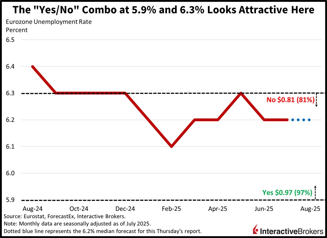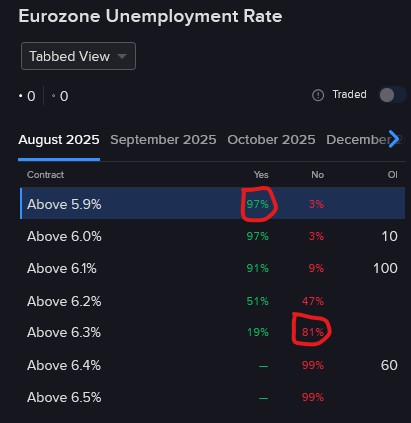The European Union’s unemployment figure has a subdued deviation rate and rarely increases by more than 0.1% on a month over month basis; it hasn’t since early 2021, shortly after the depths of the COVID-19 pandemic. It’s expected to remain unchanged at 6.2%, and out of the 30 forecasters surveyed in the monthly Reuters poll, the projections range from 6.2% to 6.3% in narrow fashion. Against this backdrop I find the risk-reward profile of the “No” at 6.3% attractive, as it’s going for $0.81. I also think the “Yes” at 5.9% is undervalued at $0.97, as a drop of 0.3% is similarly unlikely.