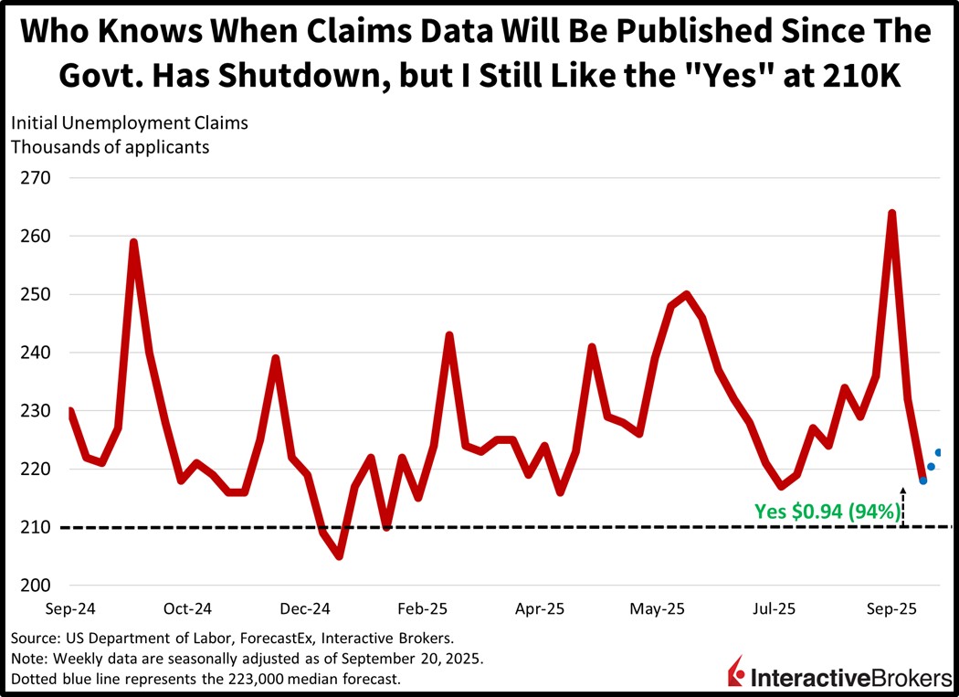 Who knows when the government will reopen and provide unemployment claim data for the week ended September 27. Still, labor conditions have been softening and the “Yes” at 210k costs $0.94 and sports an attractive risk-reward profile in my opinion. The level hasn’t been touched since January and the weekly Reuters poll consisting of 35 forecasters ranges from a minimum projection of 218k to a maximum of 236k.