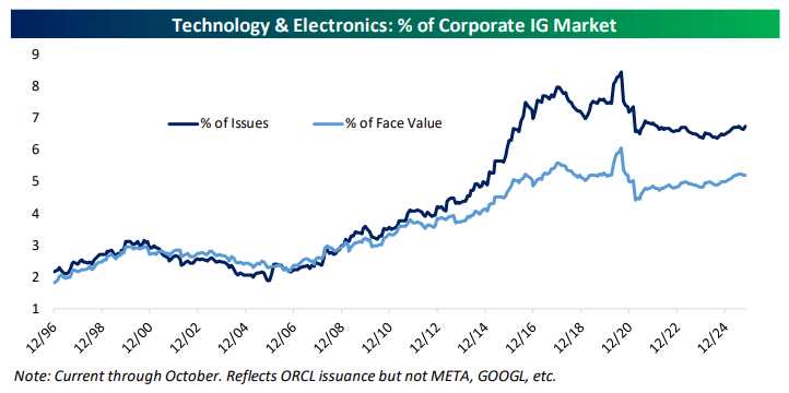Looking at the IG bond market, we just haven’t seen the sort of sustained debt binge that is the hallmark of historical, financial system-threatening blow-ups like the subprime mortgage debacle was. That’s evidenced by relatively low Tech share of IG credit outstanding, or the relatively modest size of data centers in securitized transactions. If the AI trade does melt away and leave an investment bust, a debt crisis looks relatively unlikely without years more extreme investment rates funded by debt.