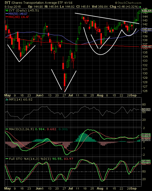 Additionally, positive chart setups have triggered which portend potentially higher prices ahead for both indexes. For the transports an inverted head and shoulders pattern has triggered with an upside target price of about $162 and cup and handle trigger with a lower target than the inverted H&S trigger of $150. Additionally, in spite of the near sideways trading action in the Dow Industrials Index, bull flag formations are in play and are suggestive of potentially higher prices as well.