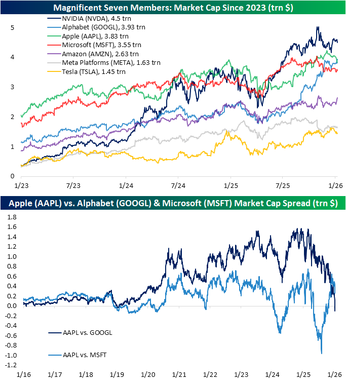 GOOGL in the #2 spot is a new development. As shown below, it has typically been either Apple (AAPL) or Microsoft (MSFT) holding that position in recent years, however, both of those stocks have pulled back as GOOGL has pressed to new highs. As shown in the second chart below, this is the first time that AAPL is smaller than GOOGL since January 29, 2019. Additionally, we would note that AAPL is currently larger than Microsoft (MSFT), but that gap has also been narrowing. In the past several years, the two stocks have repeatedly gone back and forth for the larger market cap of the two.