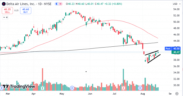 Delta is exhibiting troubling relative weakness. The stock is flat for the year, while the S&P 500 is up nearly 18%. Worse, DAL’s chart shows a bear flag pattern emerging on the daily chart.