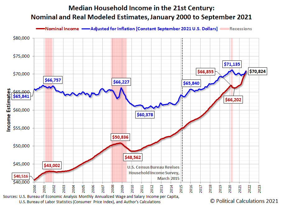 The latest update to Political Calculations' chart tracking Median Household Income in the 21st Century shows the nominal (red) and inflation-adjusted (blue) trends for median household income in the United States from January 2000 through September 2021. The inflation-adjusted figures are presented in terms of constant September 2021 U.S. dollars."