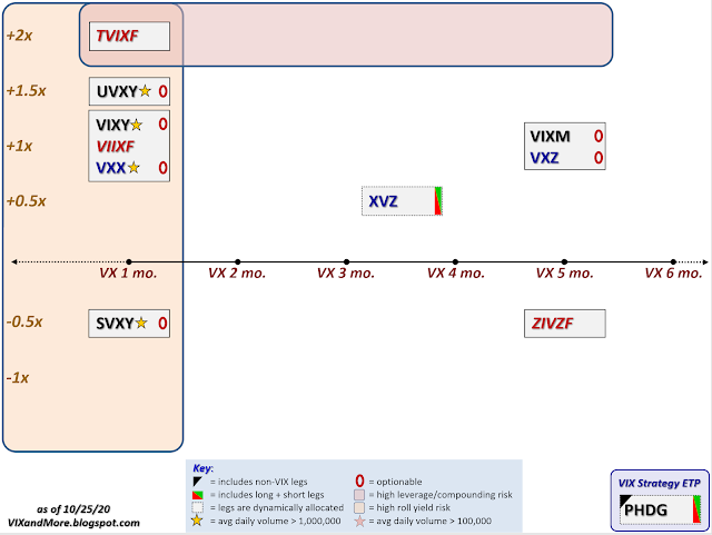 Both VXX and UVXY trade an average of over 30 million shares per day and both are regularly in the top 5-10 highest volume ETPs as well as ETP options volume leaders. The remaining VIX ETPs have been largely relegated to niche product status. Additionally, Credit Suisse delisted and suspended its VelocityShares ETNs, meaning that the former TVIX, VIIX, and ZIV now trade in the OTC market under the symbols TVIXF, VIIXF and ZIVZF. For this reason and because of low liquidity and the increased risk with trading on the OTC “pink sheets.” I have highlighted these tickers in red.