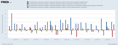 On Tuesday, the BEA released the second estimate of 4Q GDP. While the 1.9% headline number was uninspiring, the 6.6% decline in exports was the primary cause. Personal consumption expenditures rose 3%, helped by a very impressive 11.5% rise in durable goods purchases. A 9% uptick in residential building along with a 1.9 boost in equipment investment contributed to overall investment increasing 9%. As this following graph shows, the huge Q/Q drop in exports more than offset the positive contributions from personal spending and investment:
