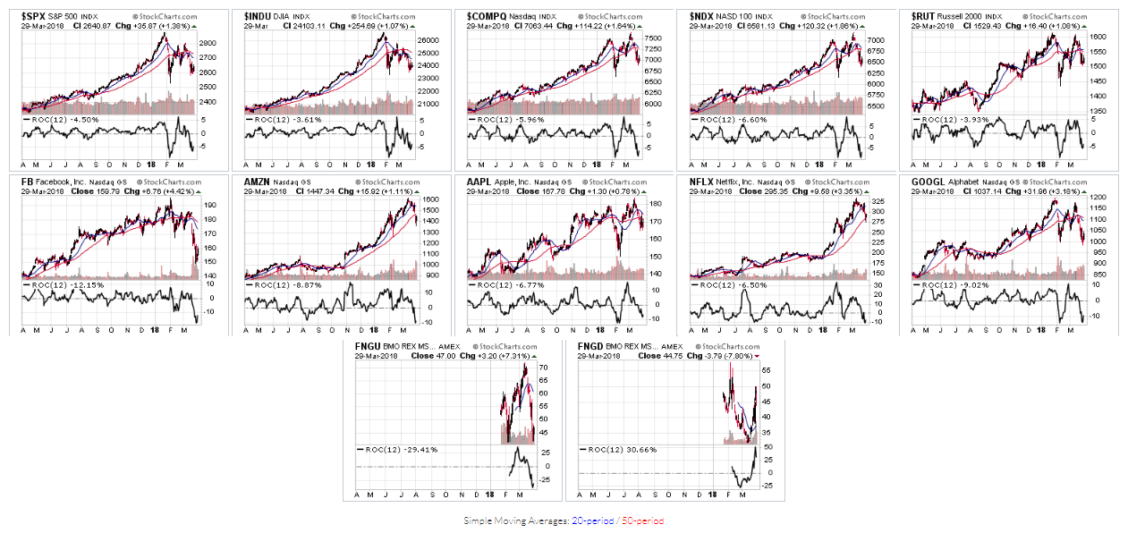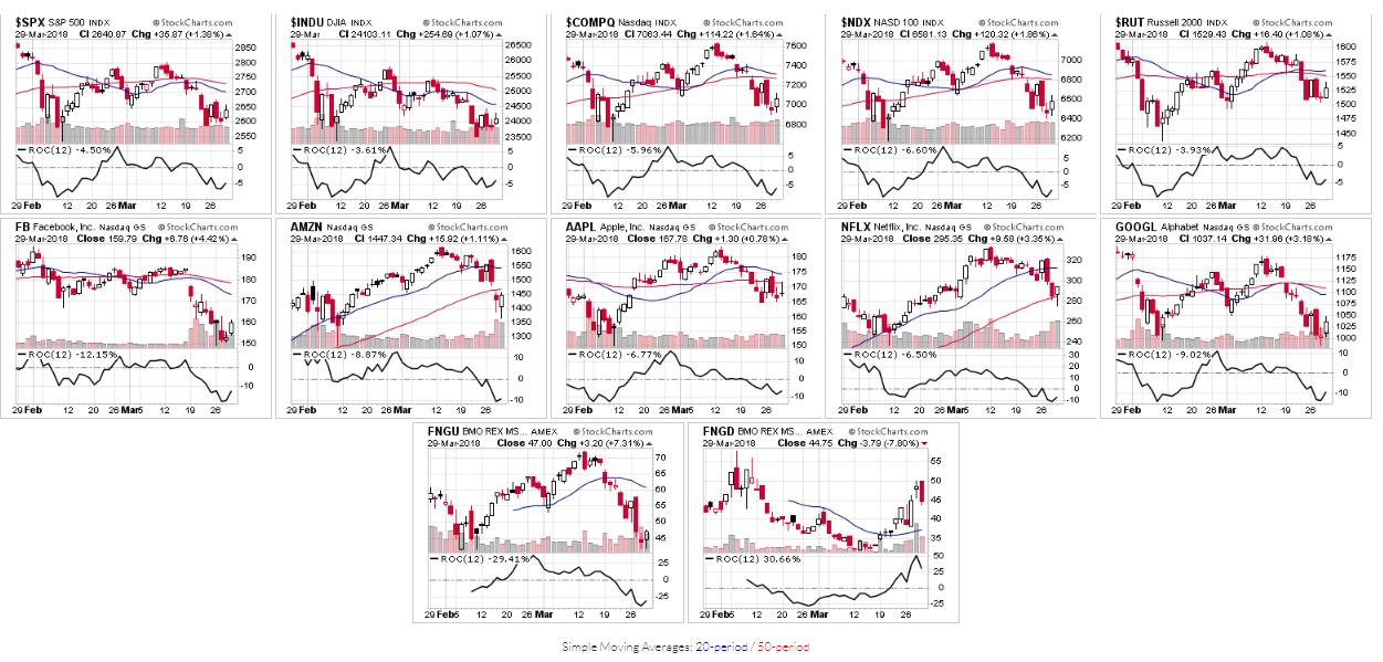 The following 1-year daily and 2-month charts of the SPX, DJI, COMP, NDX, RUT, 5 FAANGs, FNGU & FNGD show their price relative to their 50-day MA (red), as well as the Rate-of-change technical indicator.