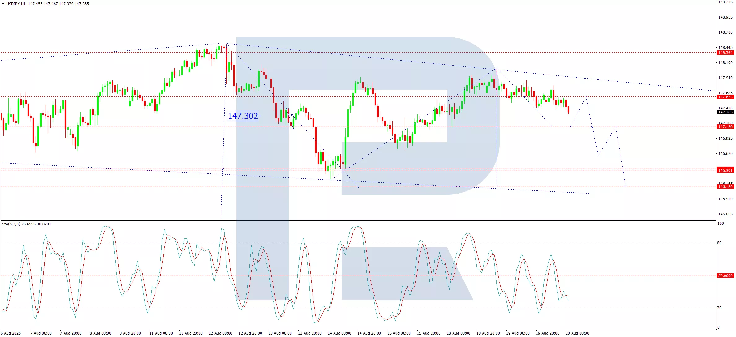 On the H1 chart, the market is shaping a downward wave structure towards 146.12. Today, we are considering a short-term move to 147.12, followed by a potential growth link to 147.60. After that, the market is likely to decline again to 146.60, and further to 146.12, continuing the bearish trend. The Stochastic oscillator confirms this view, with its signal line below the 50 level, directed sharply towards 20, reflecting a strong bearish bias.