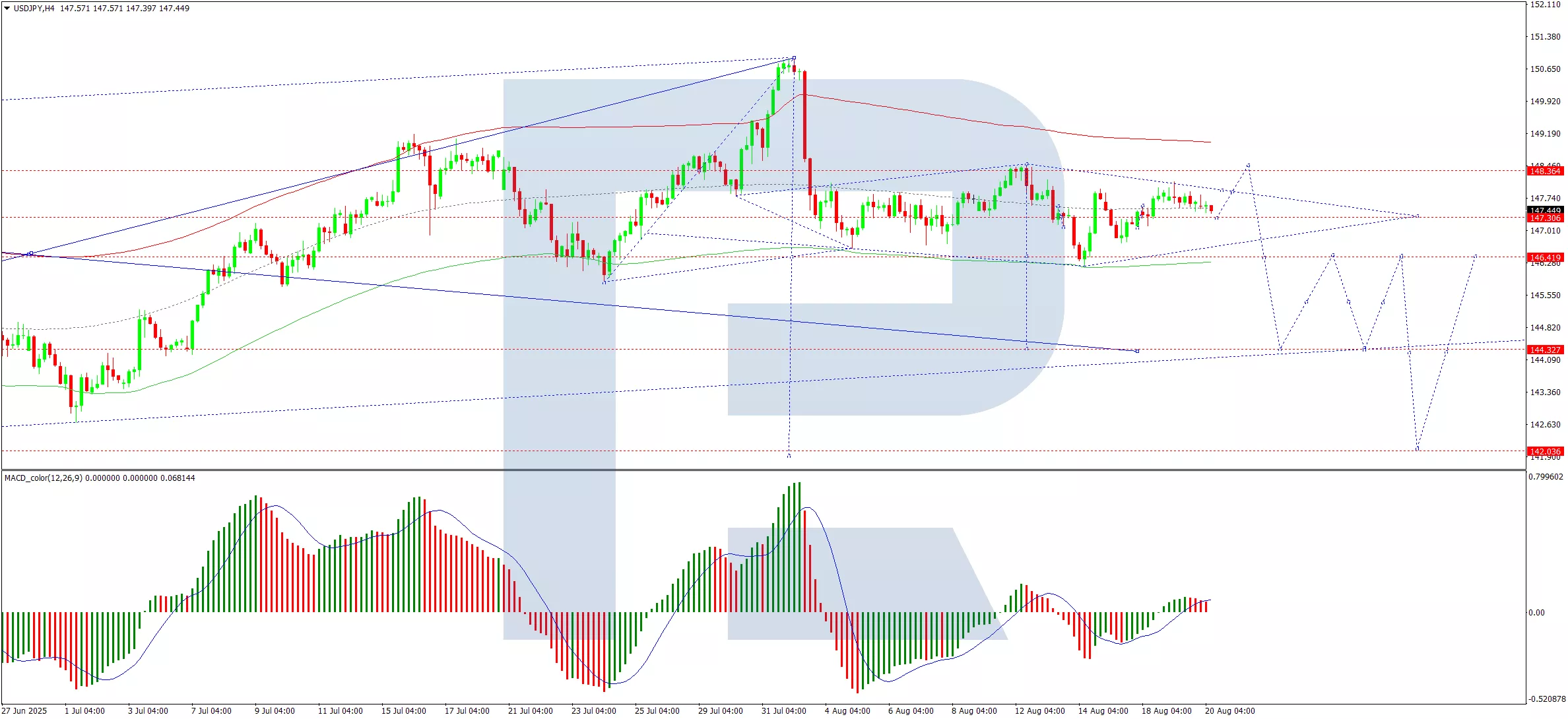 On the H4 USDJPY chart, the market continues to develop a downward wave towards 146.14. This level is expected to be reached today. A temporary rebound to 147.30 cannot be ruled out. Following that, we anticipate a further decline to 145.45, with the potential for the trend to extend to 144.30. The target remains local. This bearish scenario is technically supported by the MACD indicator, whose signal line is below zero and pointing strictly downwards, indicating ongoing downside momentum.