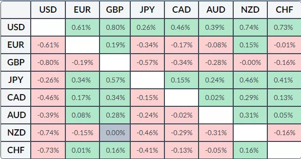The heat map shows percentage changes of major currencies against each other. The base currency is picked from the left column, while the quote currency is picked from the top row. For example, if you pick the Japanese Yen from the left column and move along the horizontal line to the US Dollar, the percentage change displayed in the box will represent JPY (base)/USD (quote).