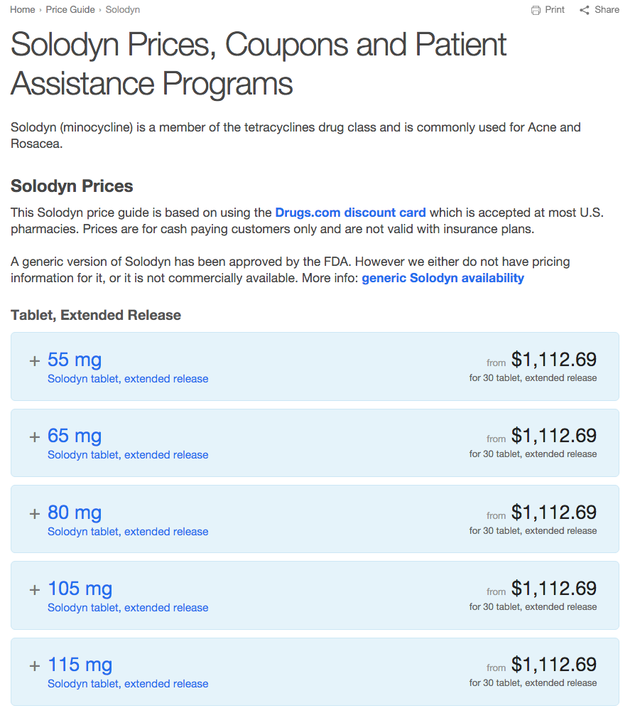 During this time, retail prices of Solodyn have climbed from about $700 in 2011 to over $1100 for a 30 day supply. On Valeant’s account, they sold more pills at higher (list) prices, despite competition from cheap generic alternatives. A holiday miracle, indeed.