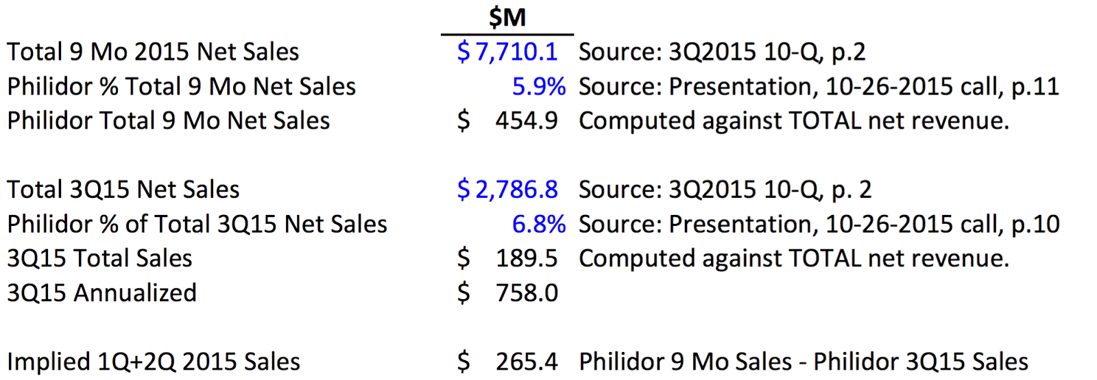 - At the time of the Purchase Option Agreement in December, 2014, Philidor YTD net sales were $111 million (p. 53)