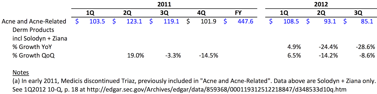 Valeant completed the acquisition of Medicis on 11 December 2012, almost three years ago today. And before Valeant’s warm embrace, sales of Medicis’ acne treatment Solodyn had fallen through the ice, so to speak, according to the respective 10-Q filings: