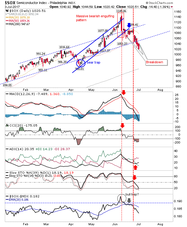 The Semiconductor Index took the greatest hit, losing over 1% as it continues to struggle to recover from its channel loss.