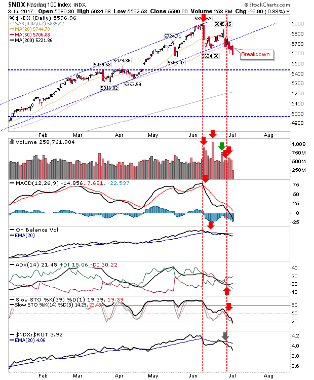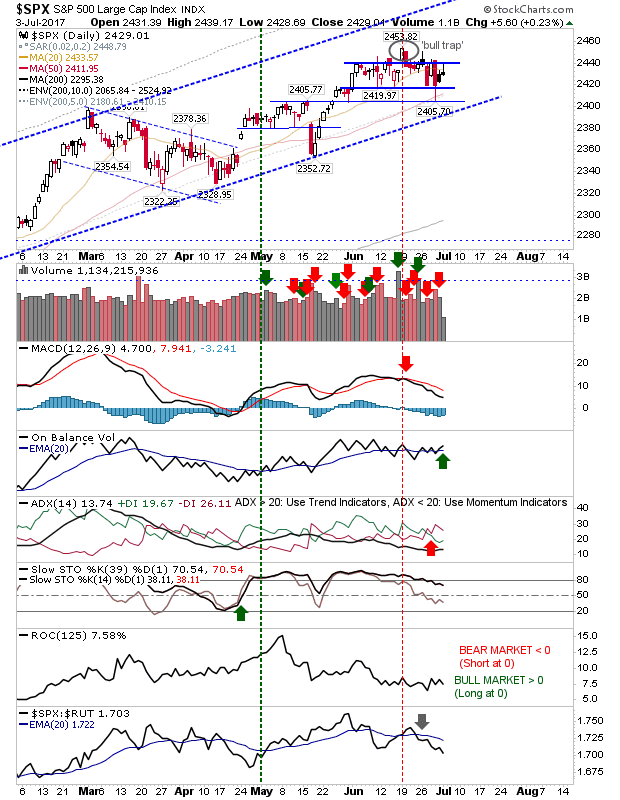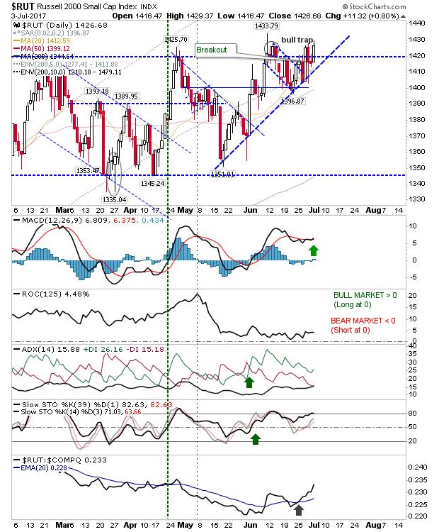 Only the Russell 2000 offered any strength as it again pushed into the June 'bull trap' and continues to suggest a major breakout is pending. Technicals show a fresh MACD trigger 'buy'.