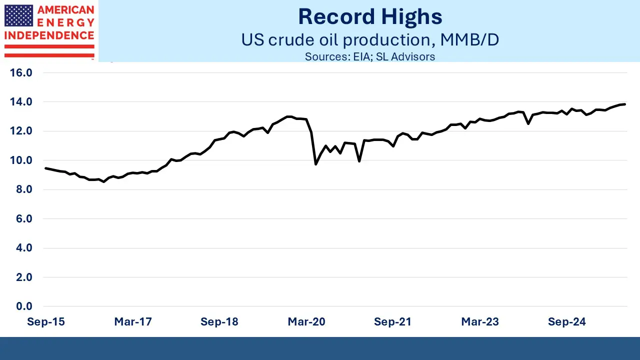 2025 hasn’t offered much in the way of dramatic new developments, simply a steady stream of confirmations that the bullish thesis from 2024 remains intact. US oil production reached a record 13.8 Million Barrels per Day (MMB/D) in September, up 5% year-on-year.