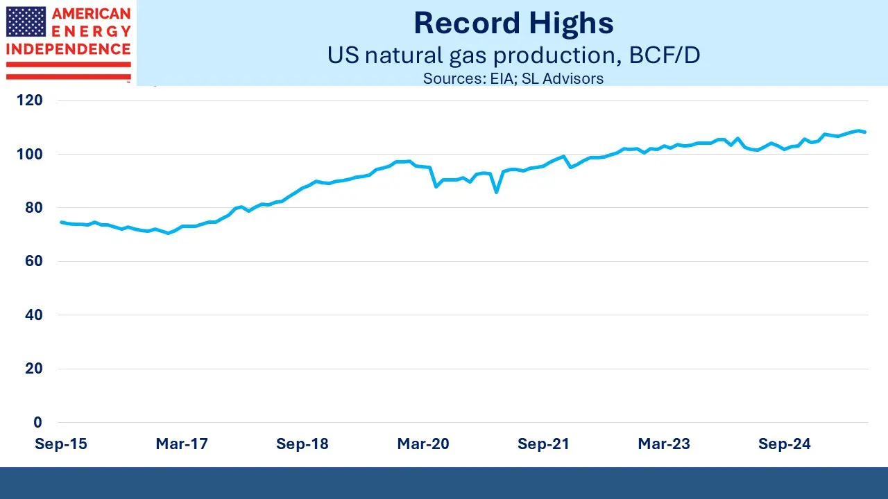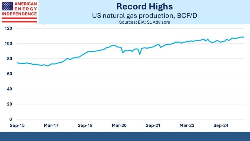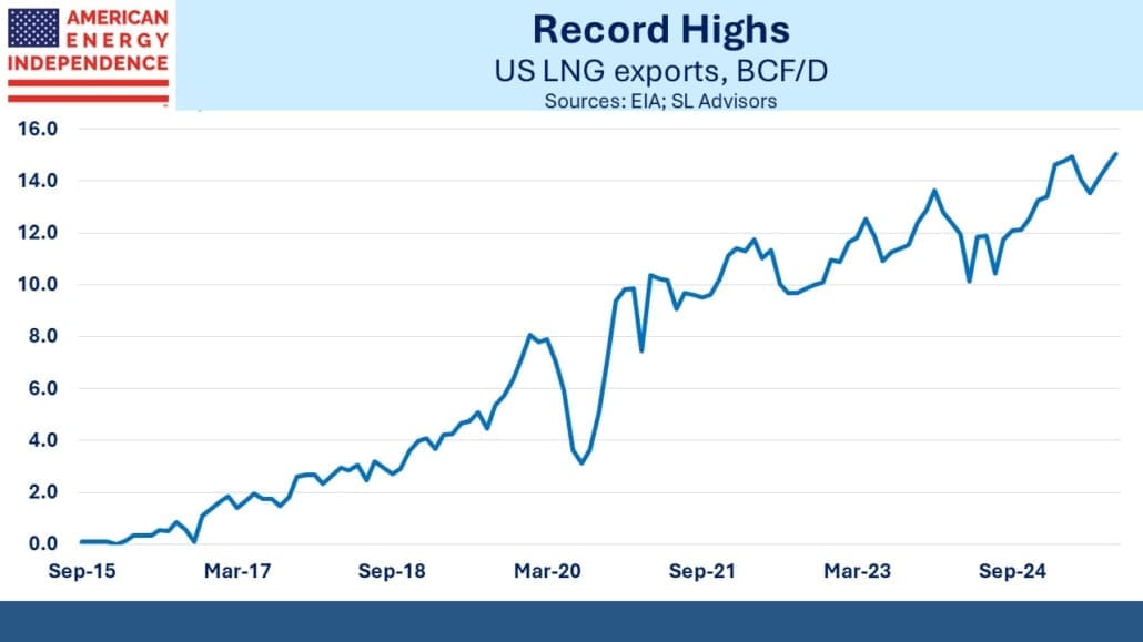 It hasn’t been an especially newsworthy year. In 2024, the realization that natural gas would benefit from the growth of data centers was an important driver of stock performance. The other source of demand, LNG exports, continued to benefit from growing liquefaction capacity.