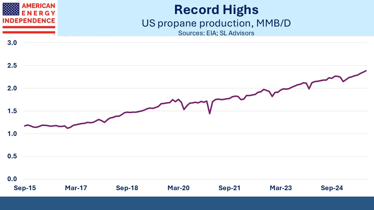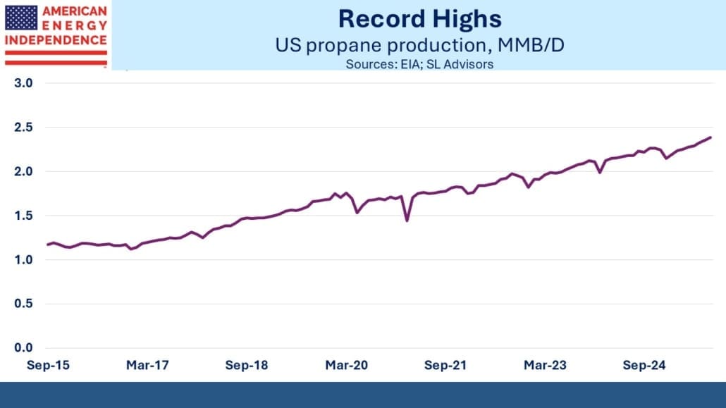 The absence of an exciting new story has weighed on midstream stocks this year, even though operating performance has been generally good. Investors are afraid of still-weaker oil prices with 2026 supply forecast to be 2-3 MMB/D in excess of demand. They’re afraid of a surplus of LNG exports as more liquefaction capacity comes online. They’re afraid that tariffs will be imposed on US exports of propane and other Natural Gas Liquids (NGLs).