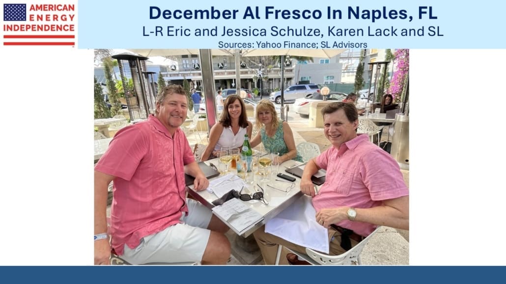 Recently, we had the good fortune to enjoy lunch with long-time investor Eric Schulze and his delightful wife Jessica, who were visiting Naples from Colorado. Whatever the weather in America, it’s usually sunny and warm in south Florida, as was the company that day.