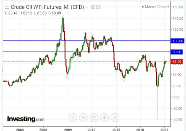 However, the following news may put a damper on bullish enthusiasm. And, if that becomes a pattern among car buyers, we could see WTI Crude Oil reach 80.00, or even 100.00, in no time (monthly chart below), unless OPEC increases production to avoid runaway inflation and voter backlash against world leaders, especially U.S. President Biden. Perhaps Joe's cancellation of the Keystone XL pipeline project through the U.S. on Day One of his administration (together with his frenetic fracking bans to please out-of-touch-with-reality world climate zealots) was (what could be) catastrophically short-sighted and ill-advised...and every day's delay in its construction will see costs skyrocket, especially if Oil spikes (OIL).