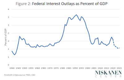 “Every family in America has to balance their budget. Washington should, too,” John Boehner liked to say when he was Speaker of the House, a sentiment often echoed by fiscal conservatives. By that standard, the debt service burden of the federal budget looks pretty modest in comparison to the 28/36 rule that is considered prudent for households. Federal interest outlays, which the CBO now pegs at about 2 percent of GDP and expects to decline toward 1 percent, figures out to just 5 to 10 percent of federal receipts. Furman and Summers consider 2 percent of GDP to be a reasonable standard for the long run. The budget in the twenty-first century is comfortably within that range so far.