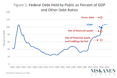 As the CBO explains, if we want a measure of the debt that is more economically accurate than the FDHP, we would end up with a lower, not a higher number. One such alternative nets out government financial assets, such as the outstanding balances on student loans. As of 2020, that lowers the debt ratio by about 10 percent, as shown in Figure 1. A further adjustment recognizes that the Federal Reserve is de facto a part of the federal government, and thus excludes its large holdings of treasury securities from “debt held by the public.” Adjusting for both government assets and the Fed’s securities holdings reduces the 2020 value of the federal debt to 65 percent of GDP. Figure 1 shows only the 2020 values of the alternative debt measures, but because both student loans and the Fed’s portfolio of securities have grown rapidly in recent years, showing full historical values would reduce the apparent rate of growth of the debt ratio as well as its current value.