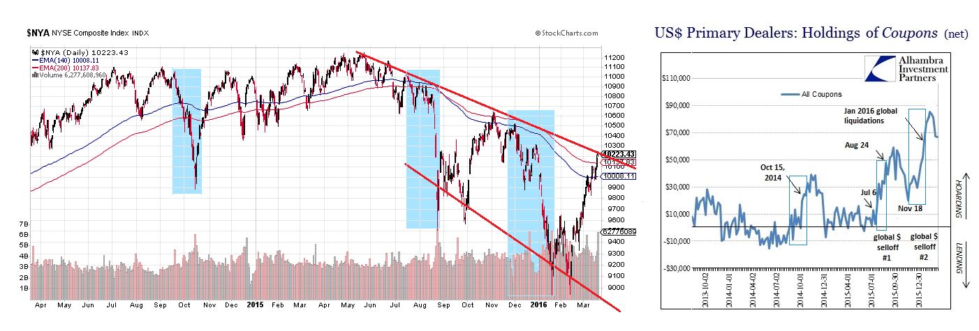 Dollar hoarding looks to be a growing problem and very tightly correlated to the timing of severe stock market sell-offs. Bouts of dollar hoarding have precisely accompanied each of the two global stock sell-offs of our current downturn, not to mention the possible foreshock to the bear turn back in October, 2014. Snider sees the late 2014 event as just that, a foreshock. He notes the rising dollar back then along with the top in a lot of markets - think CRB dropping off a 3 year plateau, European banks, the US transports. He pegged the October dollar hoarding run as "a clear warning sign".