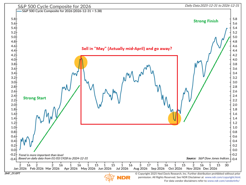 Long-time readers know that the S&P 500 Cycle Composite is the work of Ned Davis Research Group and is a blend of three key historical patterns: the one-year seasonal cycle (capturing typical intra-year trends), the four-year Presidential election cycle (reflecting tendencies around political activities), and the ten-year decennial cycle (highlighting decade-based rhythms). This composite averages daily data from 1928 through 2024 to project a "typical" path for the S&P 500 in 2026.
