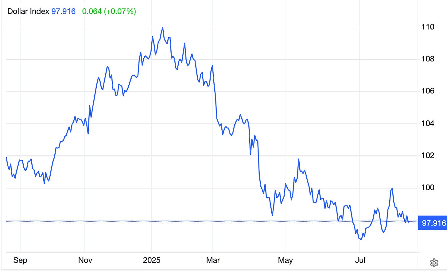 The U.S. Dollar Index (DXY) stands near 97.9, That’s down from above 110 at the start of the year. The dollar’s erosion reflects both the easing cycle that began last year, expectations that Trump’s influence will accelerate it, and that tariffs will encourage more trade settlements outside the U.S. dollar.