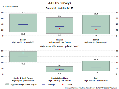 If one is to believe individual investor asset allocation responses reported by the American Association of Individual Investors, individual investors are nearly all-in on their equity exposure. The bottom half of the below chart shows equity allocation at 72% as of December which is near the 77% high reading. Also, cash allocation is at 13% and near the low reading of 11%. If interest rates are moving higher, thus bond prices declining, an underweight in bonds seems to make sense.