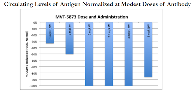 Phase 1 clinical data with MVT-5873 demonstrates the backbone HuMab-5B1 antibody to be safe and have a favorable pharmacokinetic profile at therapeutic dose levels. Importantly, biomarker data demonstrate that doses of 1 mg/kg MVT-5873 appear to normalize elevated levels of circulating CA19-9 in approximately 50% of patients and doses of 2 mg/kg appear to completely normalize levels of CA19-9 100% of patients.